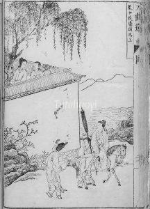This story scene originates from one of the four famous romantic plays in Yuan dynasty, Pei Shaojun on horseback meeting Li Qianjin over the garden wall (also known as On Horseback and over the Garden Wall) 裴少俊墙头马上, which was written by playwright Bai Pu (白朴 1226 – after 1306).
