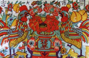 One of the most commonly used motifs that depicts household fowls. It has also been frequently used in pun rebuses with intended meaning of ‘good fortune’ or ‘good wishes’, as its Chinese pronunciation is ‘ji 鸡’, punning on ‘ji 吉’ which means good fortune. See more related pun rebus pictures: