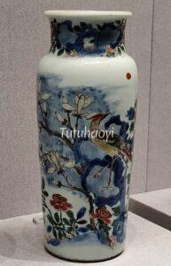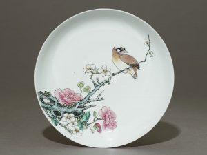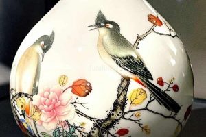 Appreciation of a top-tier porcelain garlic-head bottle vase painted with a pair of red-whiskered bulbuls in polychrome enamels over transparent glaze in the falangcai style and gilding displayed in the Petite Galerie of the Louvre in Paris.
