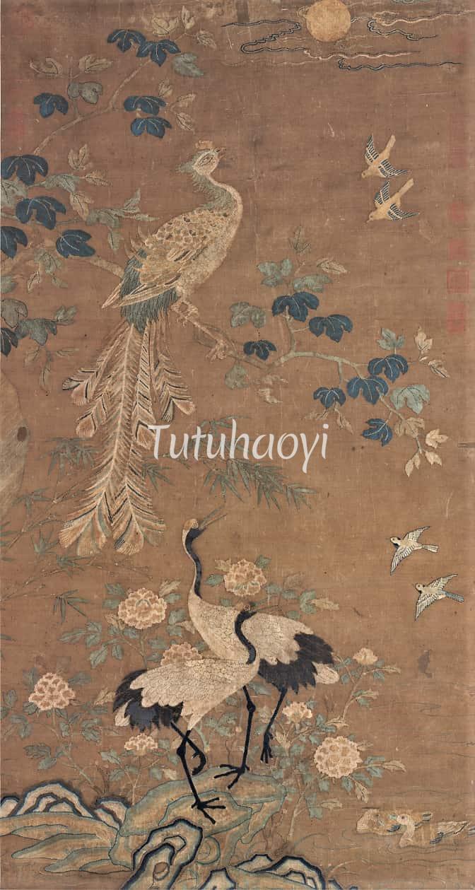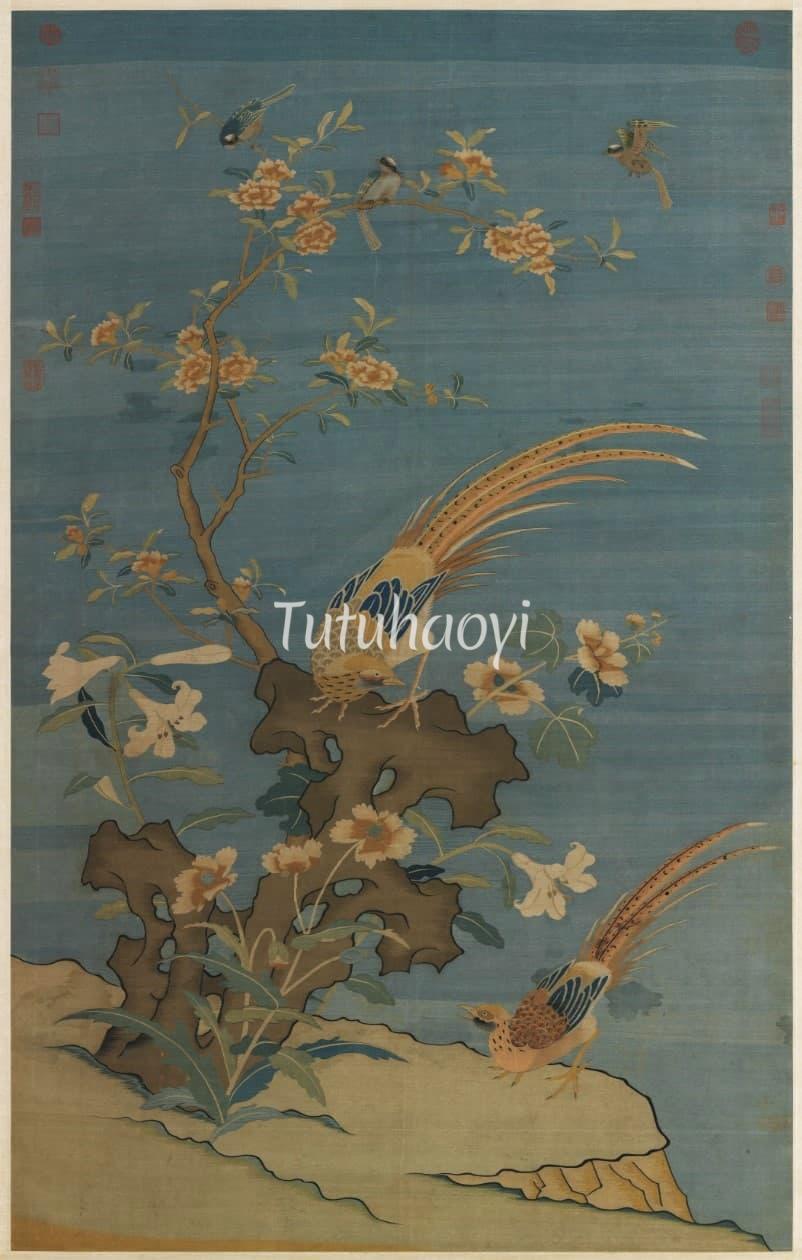 The zhi pheasant 雉, also called Huachong 华虫 in ancient China, is one of the most popular birds depicted in traditional Chinese art. Due to its characteristic multicoloured long-tail, the pheasant is associated with the wide-ranging literary talents of the emperor. It is also used in pun rebus pictures, as ‘z...