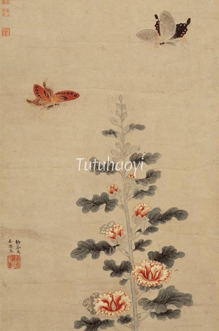 The primary symbolic meaning of the hollyhock (shu kui 蜀葵) is the good wish for longevity. The secondary implication is based on the perennially sun-facing nature of the hollyhock. In the old days, people compared their emperor or statesman to the sun and themselves to the hollyhock, implying that they would alw...