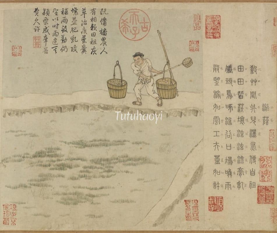 The Gengzhi Tu (耕织图, Pictures of Tilling and Weaving) was first created during the Shaoxing era of the Southern Song dynasty (12th century) by Lou Shu, a magistrate of Yuqian County. It comprised 21 Tilling Scenes and 24 Weaving Scenes, combining poetry and illustrations to systematically document agricultural a...